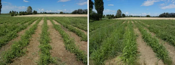 Field trial on allelopathic cover crops preceding a tomato crop in a biological farm. Left, plot with rye mulch showing the good weed suppression. Right, ... FEHLT